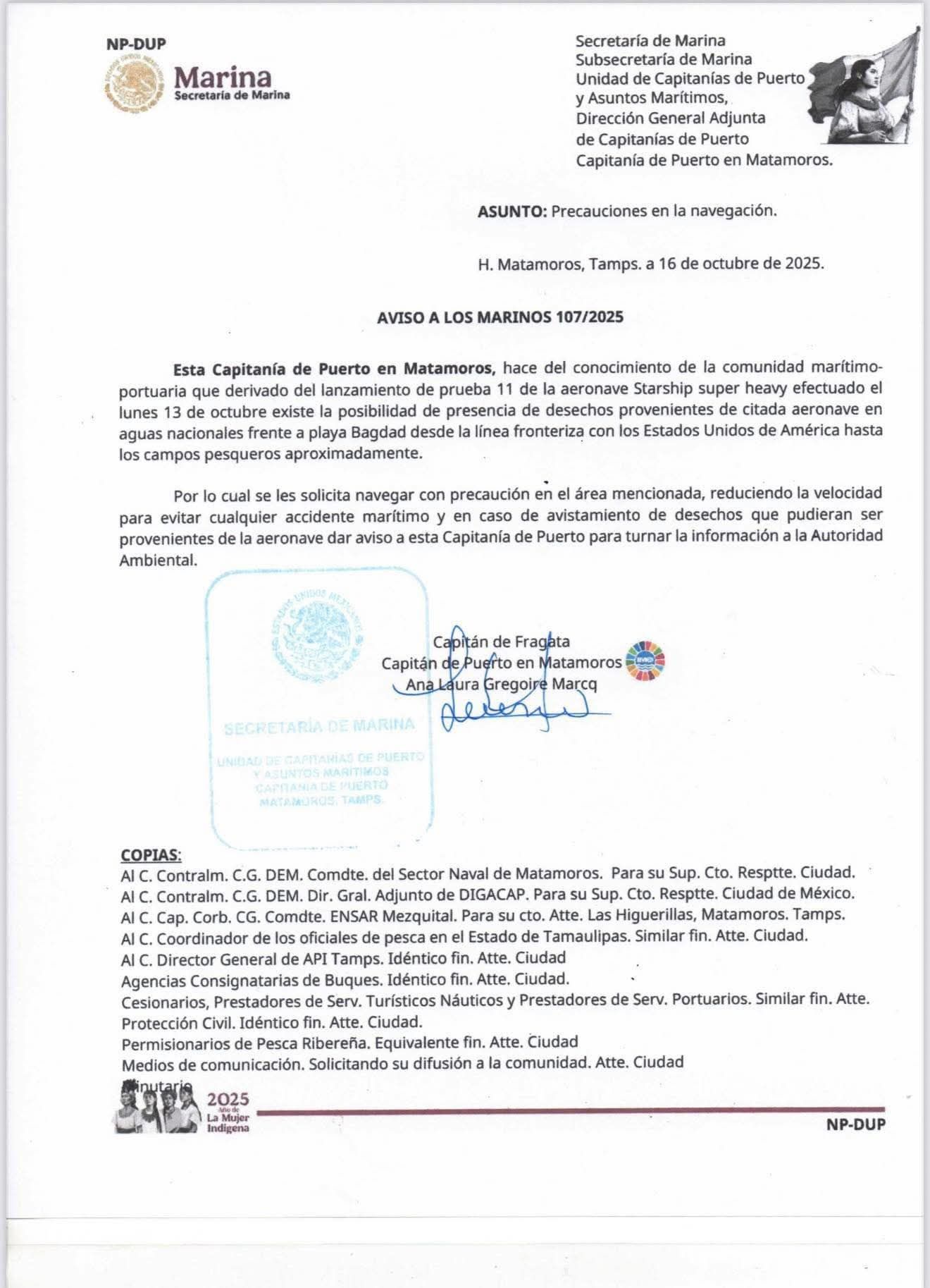La Capitanía del Puerto de Matamoros ha lo emitido una alerta para la comunidad pesquera y embarcaciones en general debido a la posible llegada de desechos del cohete Starship a Playa Bagdad, Tamaulipas.